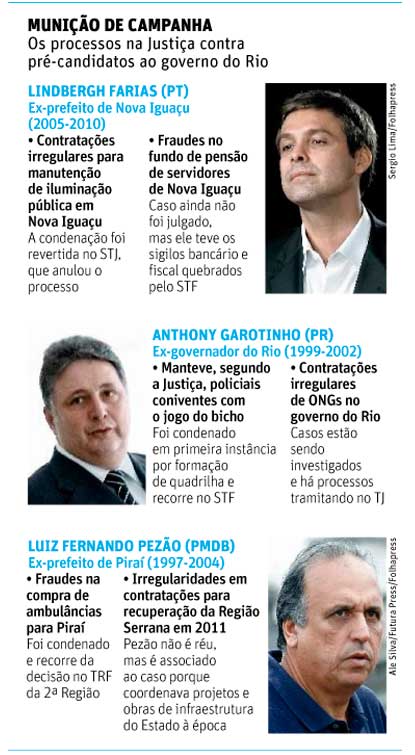 O senador Lindbergh Farias (PT), o deputado federal Anthony Garotinho (PR) e o vice-governador Luiz Fernando Pezão (PMDB) enfrentam acusações do Ministério Público que viraram munição para os adversários. Todos os casos envolvem administrações anteriores dos postulantes ao Palácio Guanabara.
