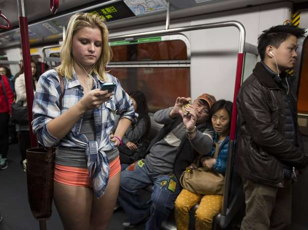 Uma mulher viajou sem calça, vestindo apenas calcinha, no metrô de Hong Kong, neste domingo. Ela participa de um evento chamado "Viagem de metrô sem calças", no qual participantes tiram as calças e seguem uma rotina normal.