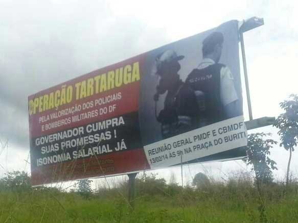Em operação tartaruga, intensificada há dois meses, militares do Distrito Federal instalaram sete outdoors em quatro regiões administrativas durante o fim de semana cobrando do governo isonomia salarial e reestruturação da carreira. O movimento disse que vai colocar mais 11 letreiros e distribuir 40 mil panfletos a partir desta segunda-feira (27). O secretário de Segurança Pública, Sandro Avelar, admitiu que houve queda na produtividade policial e disse que "não tem nada que justifique esse tipo de movimento", porque há "diálogo com o governo." Ele afirmou ainda considerar o termo "operação tartaruga" prejorativo.